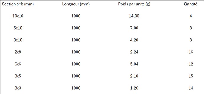 - Du balsa sous forme de baguette d’1m de longueur, avec des sections différentes (cf. tableau).