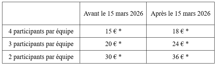 - Les inscriptions ouvriront à partir du 26 janvier 2026 et seront clôturées le 5 avril 2026. Toutefois, si le nombre d’équipes maximum que nous pouvons accueillir (25 équipes environ) est atteint, les inscriptions seront fermées automatiquement plus tôt.